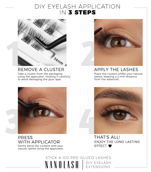 Τα τουφάκια βλεφαρίδων Nanolash Stick & Go Pre-Glued είναι μια καινοτόμος λύση σχεδιασμένη για όσους εκτιμούν την ευκολία και την γρήγορη εφαρμογή. Χάρη στην εύκαμπτη και ανθεκτική στις παραμορφώσεις δομή τους, αυτές οι βλεφαρίδες διατηρούν το τέλειο σχήμα τους καθ' όλη τη διάρκεια της χρήσης. Οι ίνες τοποθετούνται σε εξαιρετικά λεπτές, εύκαμπτες ταινίες προεπικαλυμμένες με διαφανή κόλλα, επιτρέποντας γρήγορη εφαρμογή χωρίς την ανάγκη πρόσθετων προϊόντων. Μόλις εφαρμοστεί κάτω από τις φυσικές βλεφαρίδες, τα σημεία σύνδεσης παραμένουν αόρατα, εξασφαλίζοντας μια φυσικά πιο γεμάτη γραμμή βλεφαρίδων. Κάθε θήκη περιέχει ένα απλικατέρ και 36 τουφάκια βλεφαρίδων σε τρία μήκη - 10, 12 και 14 mm - επαρκή για 4-6 εφαρμογές ανάλογα με το μέγεθος των ματιών. Το αποτέλεσμα ενός όμορφου βλέμματος μπορεί να διαρκέσει έως και 3 με 5 ημέρες.